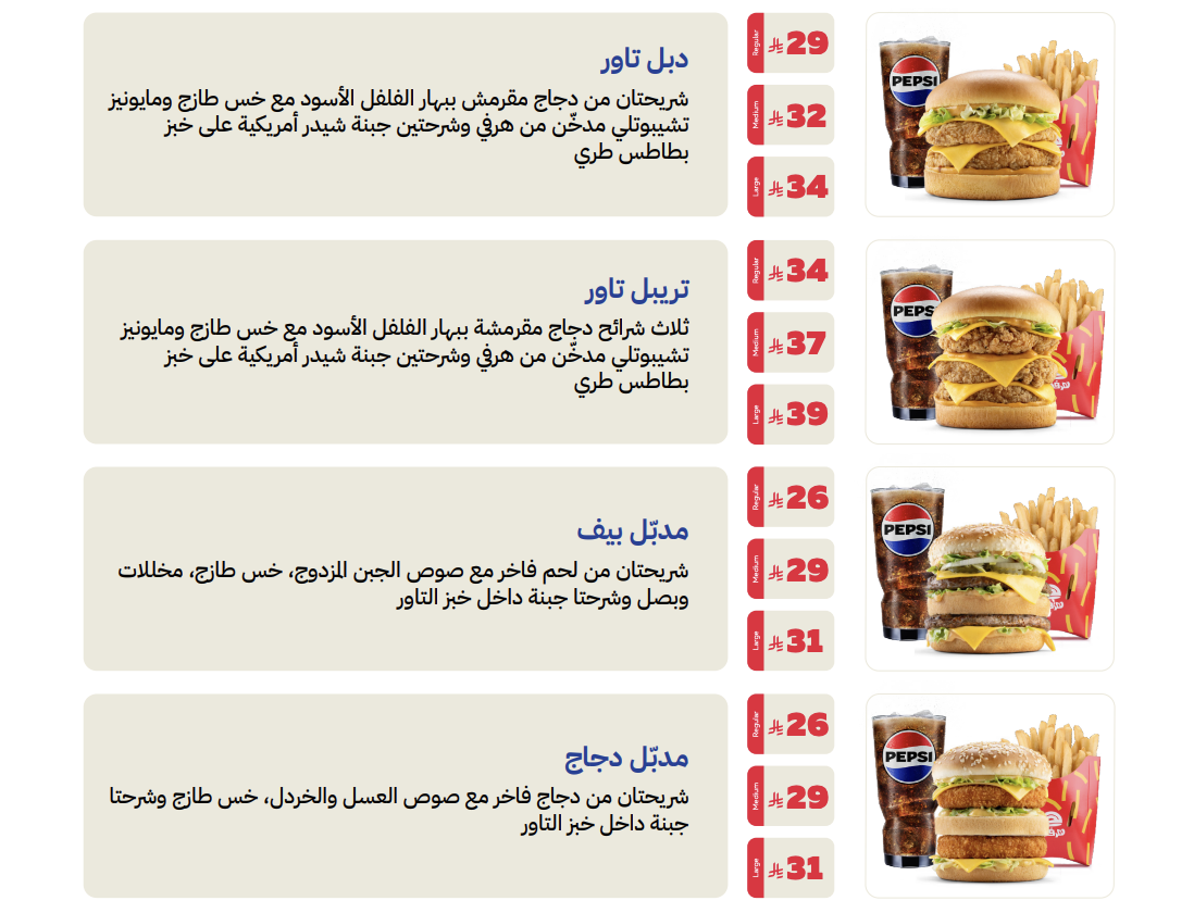 أكثر من 40 عامًا خدمة الوطن وجبات كومبو حمل التطبيق و احصل على عروض حصرية قم بتنزيل تطبيقنا Apple وشعار Apple علامتان تجاريتان لشركة Apple Inc.، مسجلتان في الولايات المتحدة ودول أخرى. App Store علامة خدمة لشركة Apple Inc. Google Play علامة تجارية لشركة Google Inc. تسري الشروط.